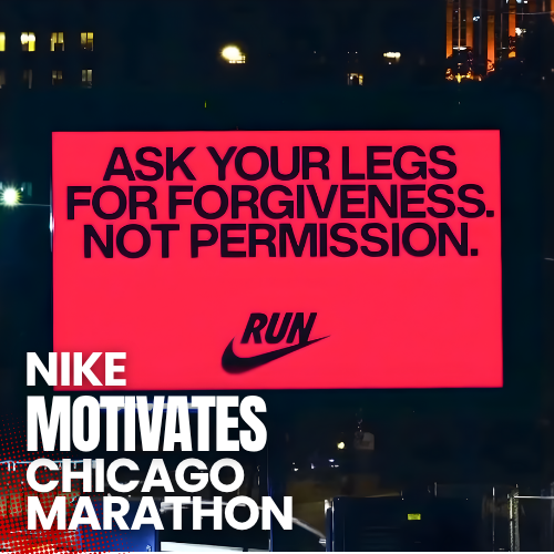 The campaign stretched across Chicago’s marathon route with strategically placed billboards and digital screens that runners could see at different milestones. Nike’s messages stood out for their simplicity and authenticity, blending seamlessly with the city’s urban landscape. This immersive approach transformed OOH and DOOH media into emotional support tools for thousands of runners.