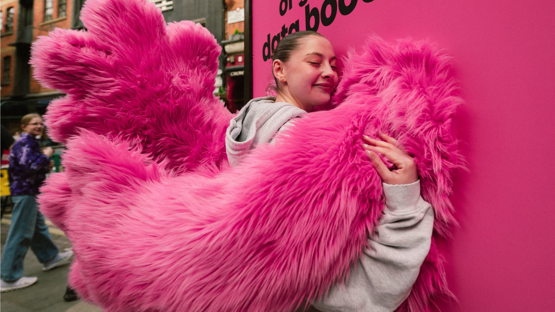 It is a bespoke six-sheet billboard with memory foam and furry arms that gives passersby a literal hug.