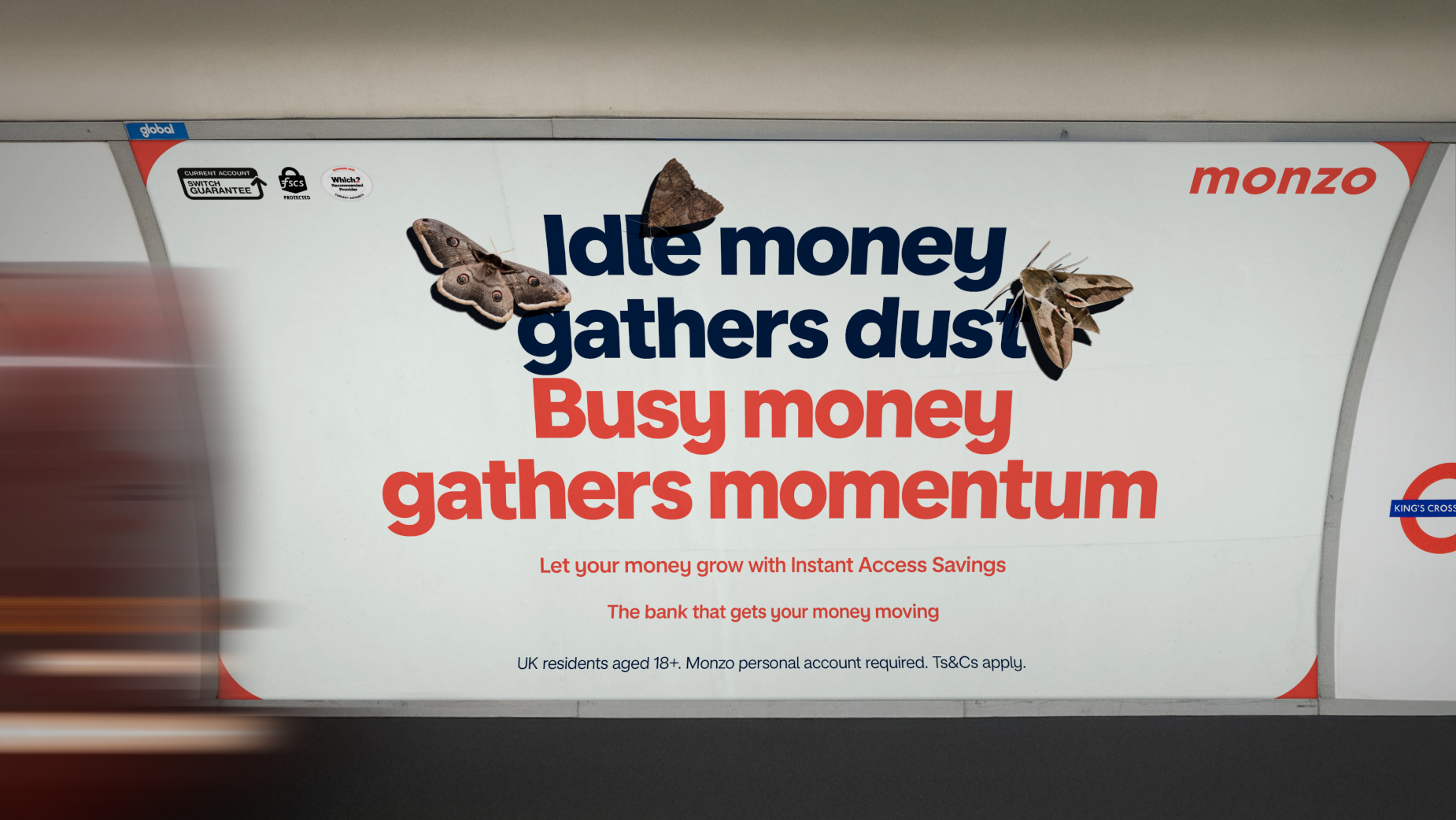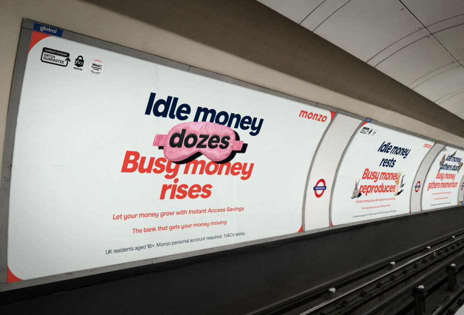 Monzo launched a nationwide integrated campaign led by OOH to promote its “Get Your Money Moving” platform, using visual metaphors to show how idle money becomes active savings and investments through automated banking tools.